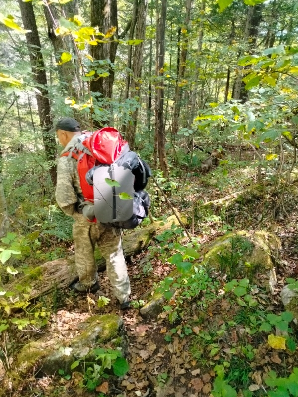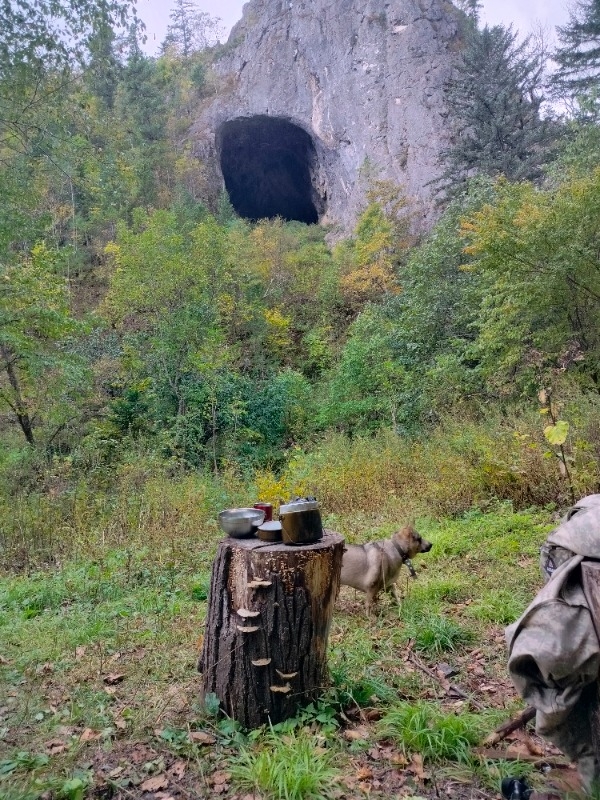 Дальше шли пешком, дошли до таблички охотничье хозяйство Тетюхе, площадка номер 1, приток реки Кривой ( как то так или что-то подобное). Спустились с перевала и на первой развилке ушли налево пока не дошли до реки, шли вдоль реки и вышли к пещере. Обратно заблудились, трека конкретного не было брали сопки "влоб" ходили кругами. Пока не вышли на тропинку, по который пришли к реке. Трек здесь на ресурсе недействительный.